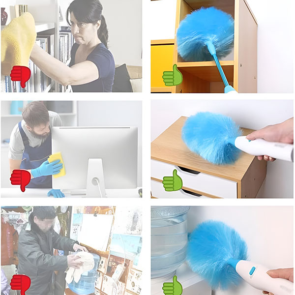De buigbare kop past zich aan elke vorm aan, waardoor je moeiteloos plafondventilatorbladen, kasttoppen, meubelranden en krappe hoeken kunt reinigen. Stof verstopt zich overalβdeze stofdoek vindt het allemaal!