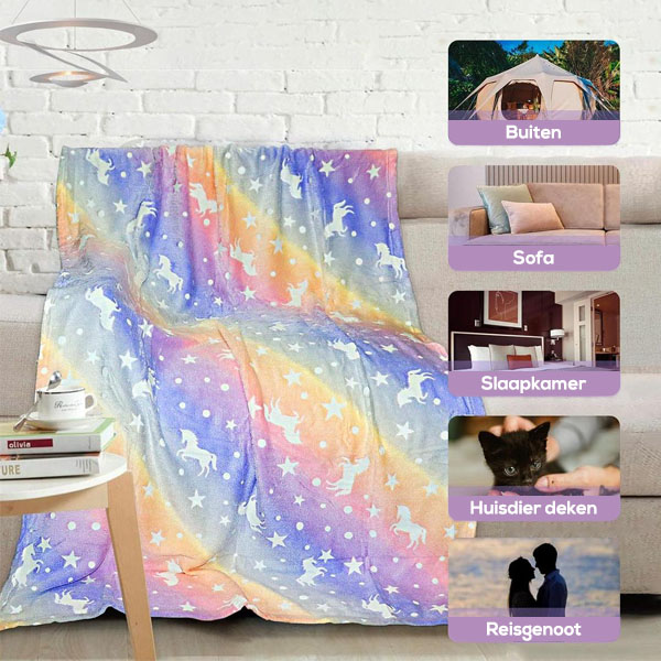 Een knusse en warme deken die ‘s nachts licht geeft! Je kunt kiezen uit een eenhoorn- of dinosauruspatroon!